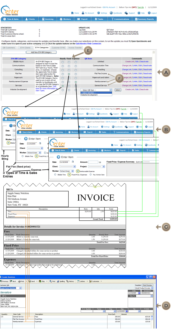 EnterYourHours.com invoice transfers to the Quickbooks Invoice (orange lines from -> ).