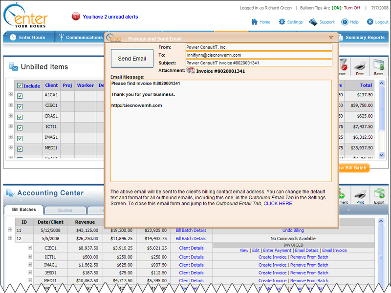 One click creates the invoice. Another click opens up the preconfigured email form, and the final click sends it off for payment. It's that simple.