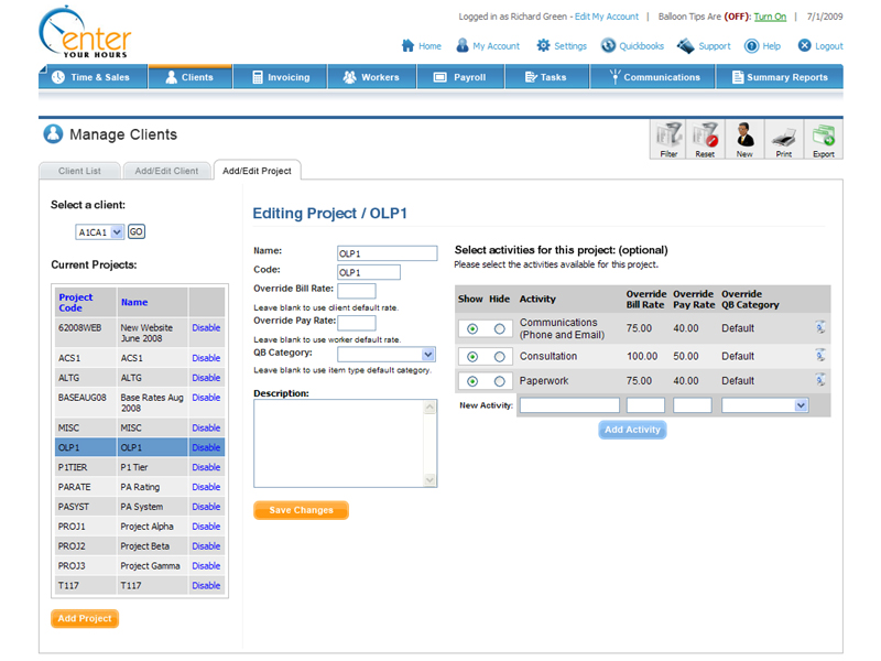 Store your client data include base billing rate, and override billing rates based on workers. Create, edit, and delete projects and activities for your clients, and put in override rates at any level so you can precisely control how your client is billed.