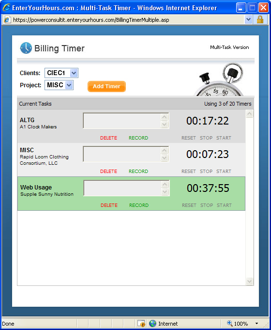 Track multiple timer sessions throughout your work day. Stop a timer for one client or project, and then start the timer for another. Return to the first timer and pick up where you left off. You can run up to ten timers per day.